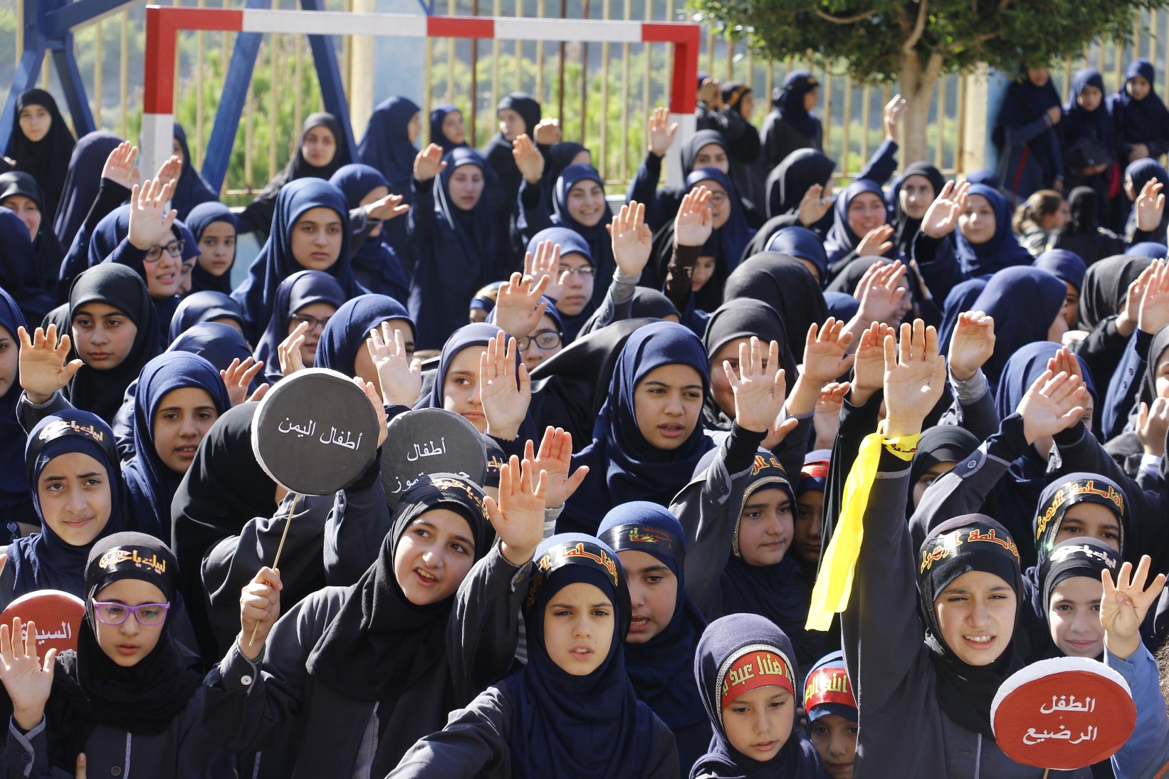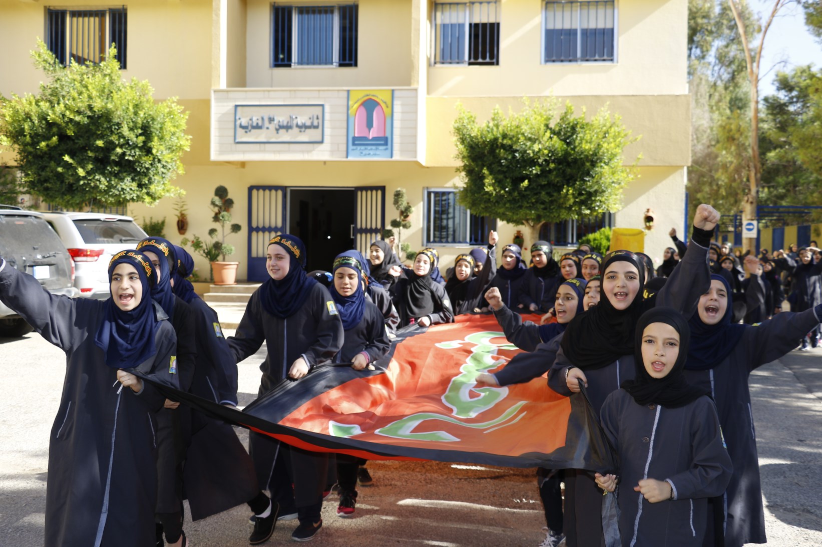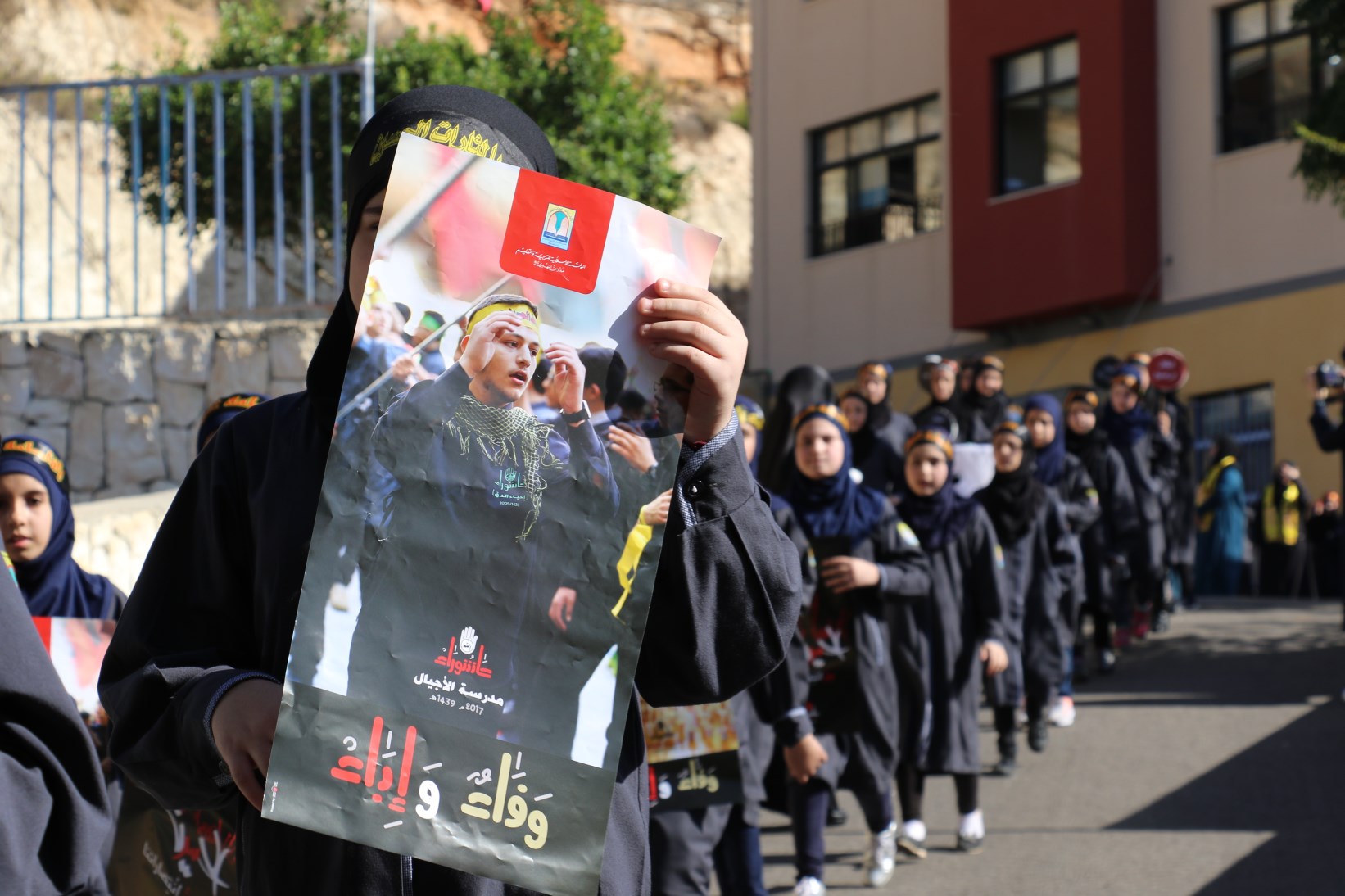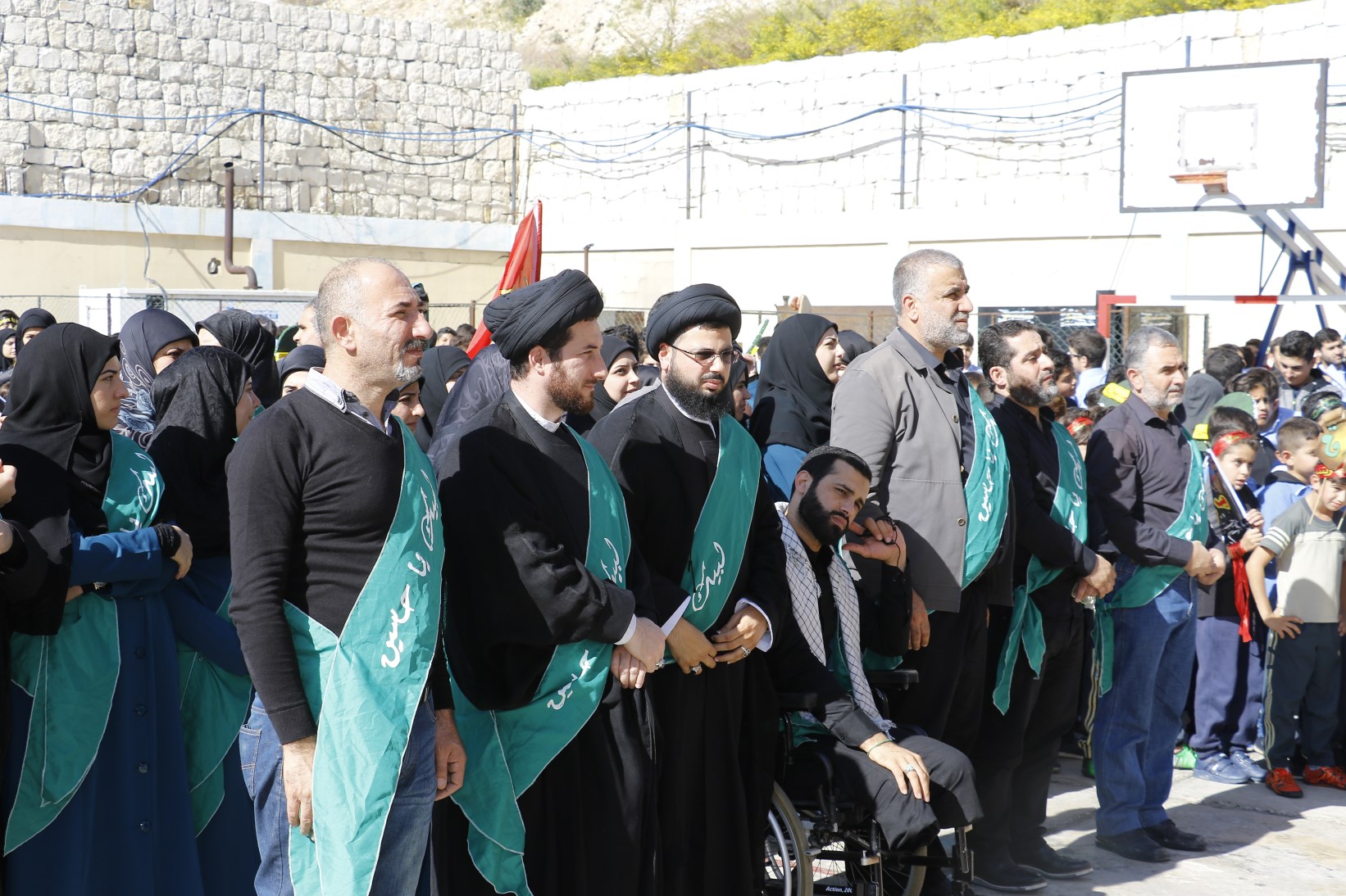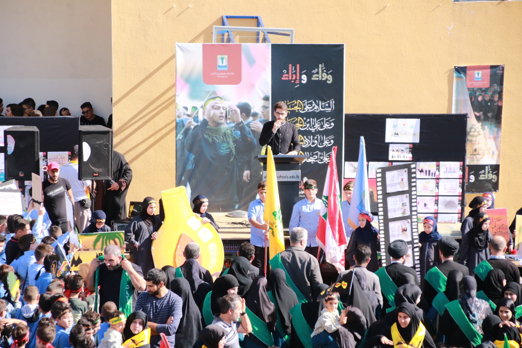 بدأت المراسم بمسيرة داخل حرم الثانويّة تقدّمها حملة الرايات والشعارات والمجسّمات الحسينيّة ومواكب التضامن مع أطفال اليمن وفلسطين على وقع الهتافات واللّطميّات الحسينيّة للرادود الشيخ حسن الزين. وافتُتح التجمّع بتلاوة سورة الفاتحة عن أرواح شهداء المقاومة الإسلاميّة، واعتلى المنبر بعدها الجريح حسين عاصي ليردّد أهزوجة "عشّاق الولاية"، واختُتمت المراسم بقراءة دعاء الحجّة (ع).