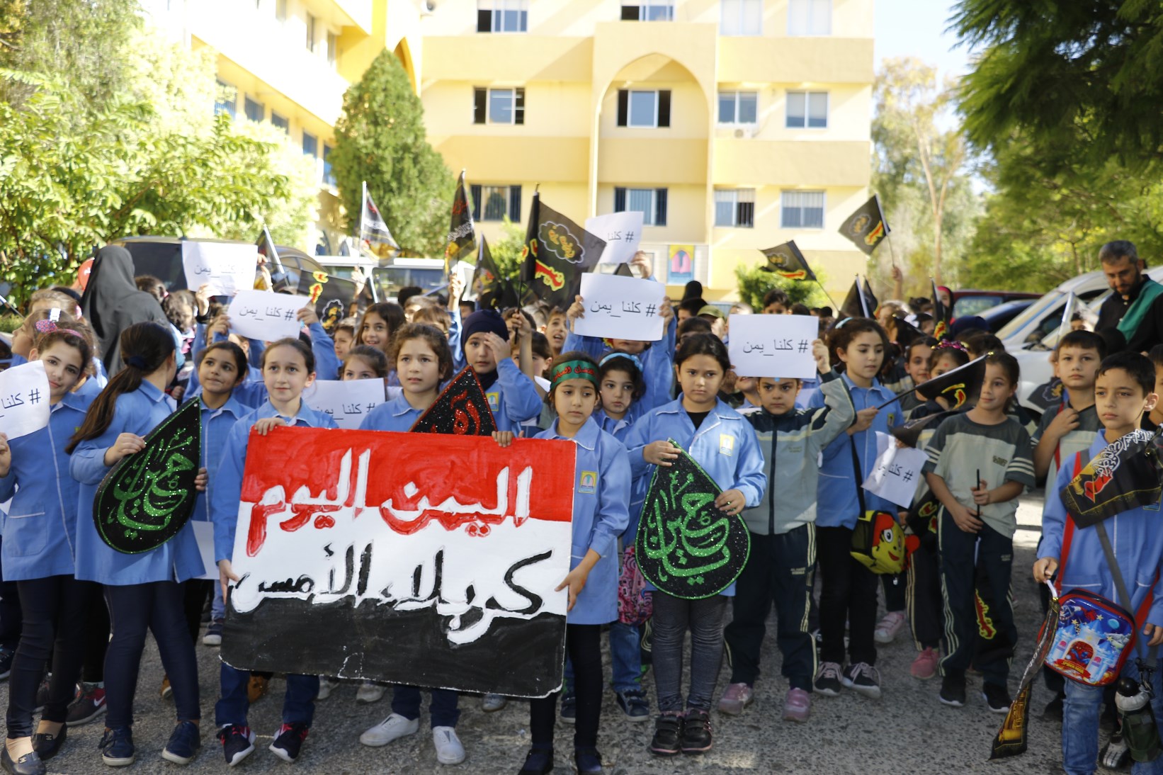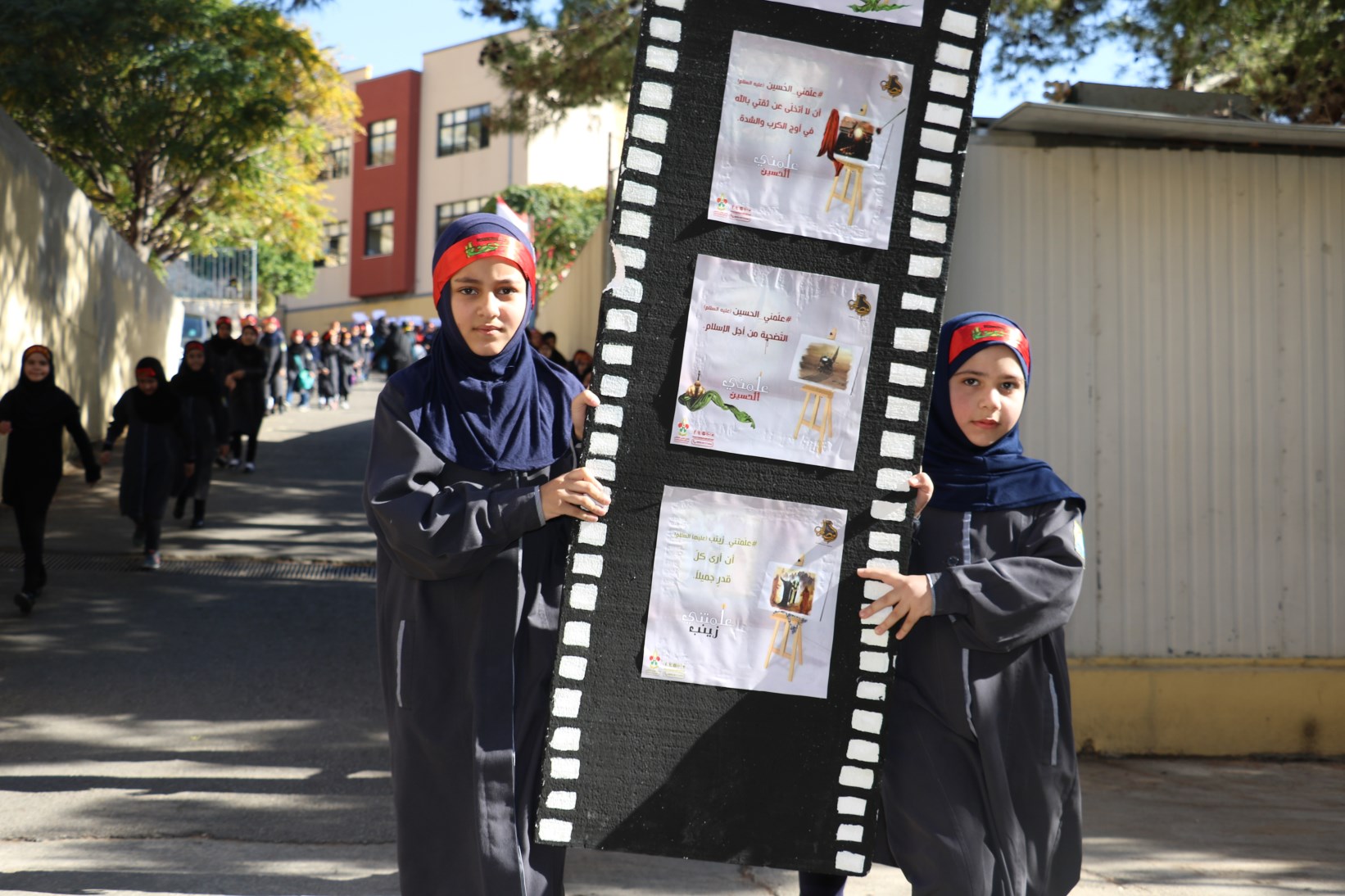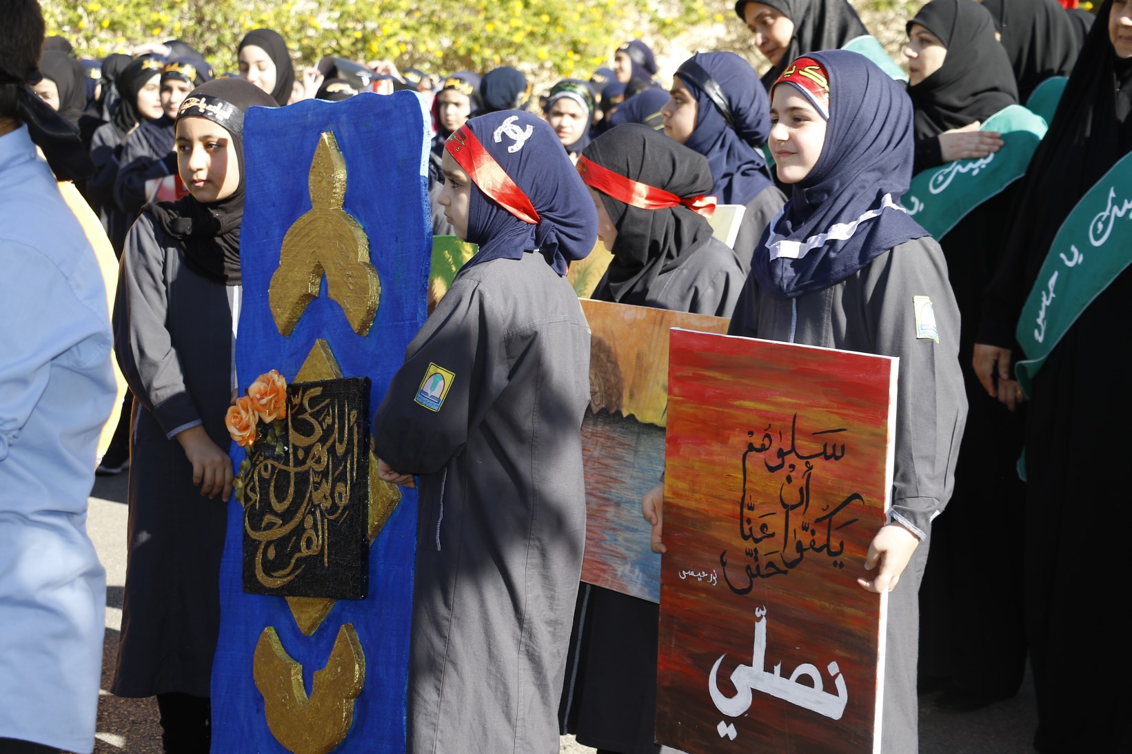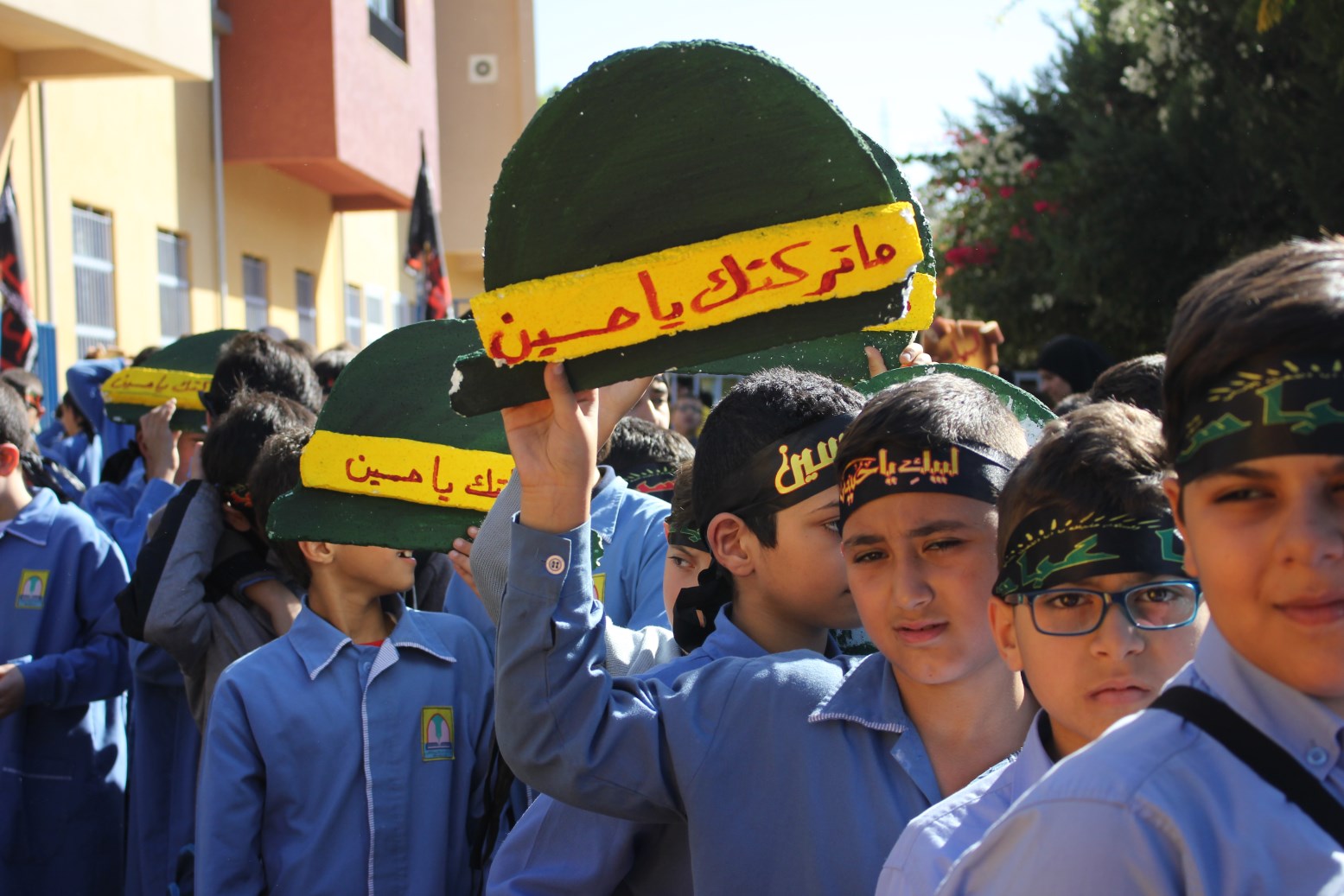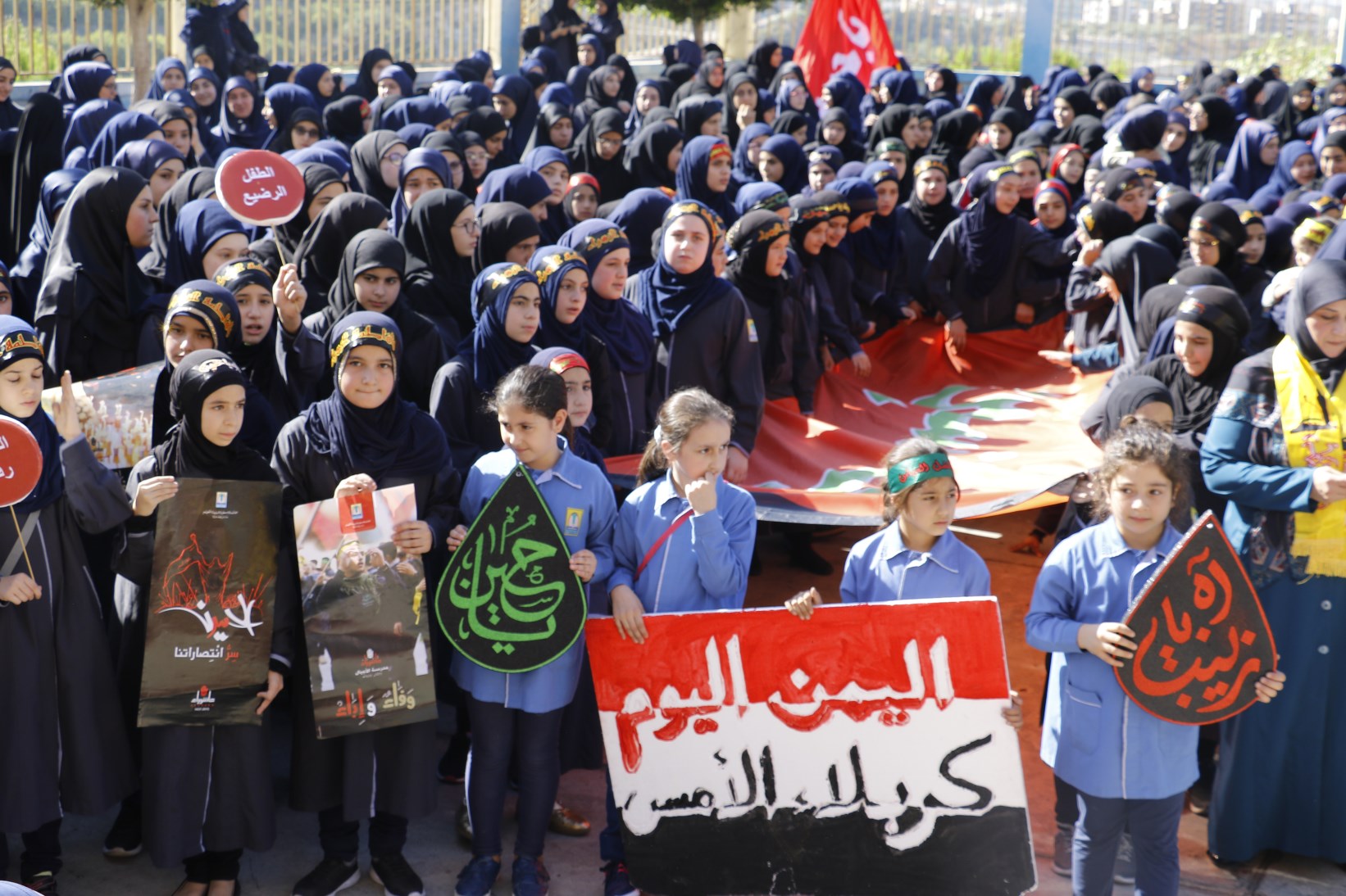 بدأت المراسم بمسيرة داخل حرم الثانويّة تقدّمها حملة الرايات والشعارات والمجسّمات الحسينيّة ومواكب التضامن مع أطفال اليمن وفلسطين على وقع الهتافات واللّطميّات الحسينيّة للرادود الشيخ حسن الزين. وافتُتح التجمّع بتلاوة سورة الفاتحة عن أرواح شهداء المقاومة الإسلاميّة، واعتلى المنبر بعدها الجريح حسين عاصي ليردّد أهزوجة "عشّاق الولاية"، واختُتمت المراسم بقراءة دعاء الحجّة (ع).