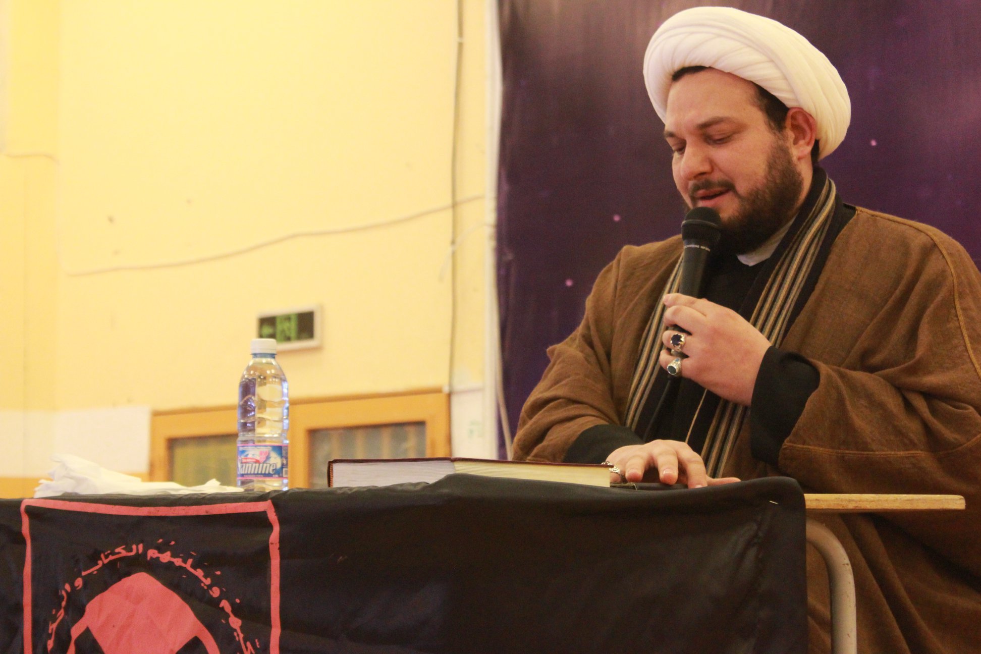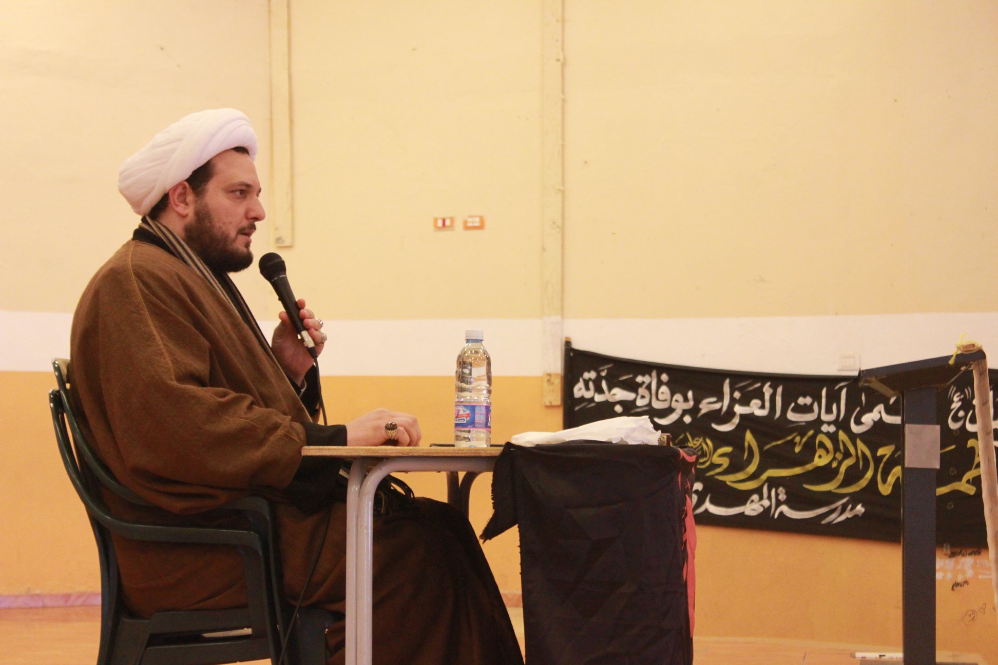 بهذه الكلمات ودع أمير المؤمنين (ع) رفيقة دربه وجهاده السيدة الزهراء (ع) وبالدموع والآهات ودع معلمو ومعلمات مدرسة المهدي (ع)- المجادل بضعة رسول الله (ص) في مجلس عزاء احياه سماحة المرشد الديني في ذكری شهادة الصديقة الطاهرة (ع).