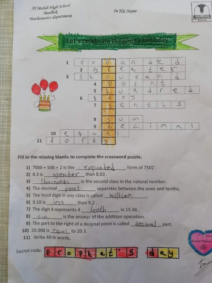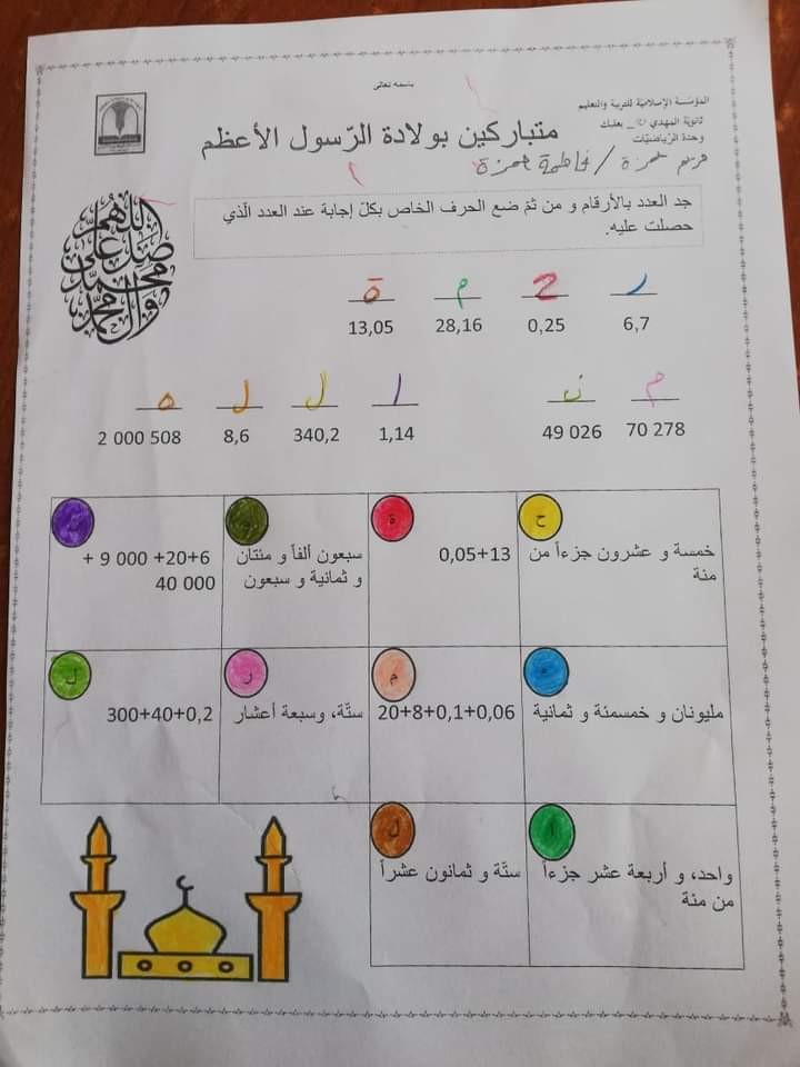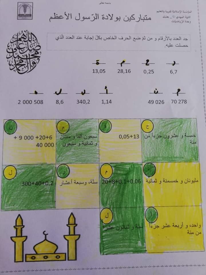 المشاركة احتفلت وحدة الرياضيات بمولد الرسول الأكرم محمد(ص) على طريقتها فمن خلال العمليات الحسابية والأنشطة التفاعلية التي نفذها التلامذة حصلت على اسماء وألقاب النبي محمد (ص) . أخبار مستوى ثانيأخبار مستوى ثاني - بعلبكمناسبة