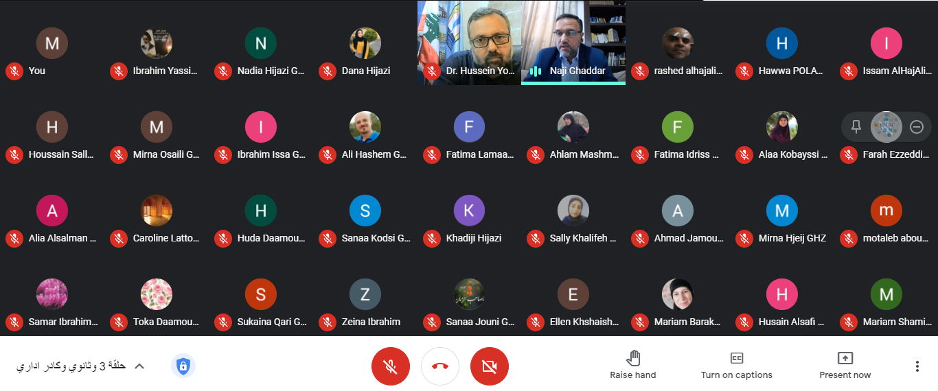 المشاركة أقامت ثانوية المهدي(ع)- الغازية لقاءها السنوي العام للكادر التعليمي والاداري مع مدير عام المؤسسة الاسلامية للتربية والتعليم الدكتور حسين يوسف وذلك عبر تطبيق meet أخبار مستوى أولأخبار مستوى أول - الغازيةخبر
