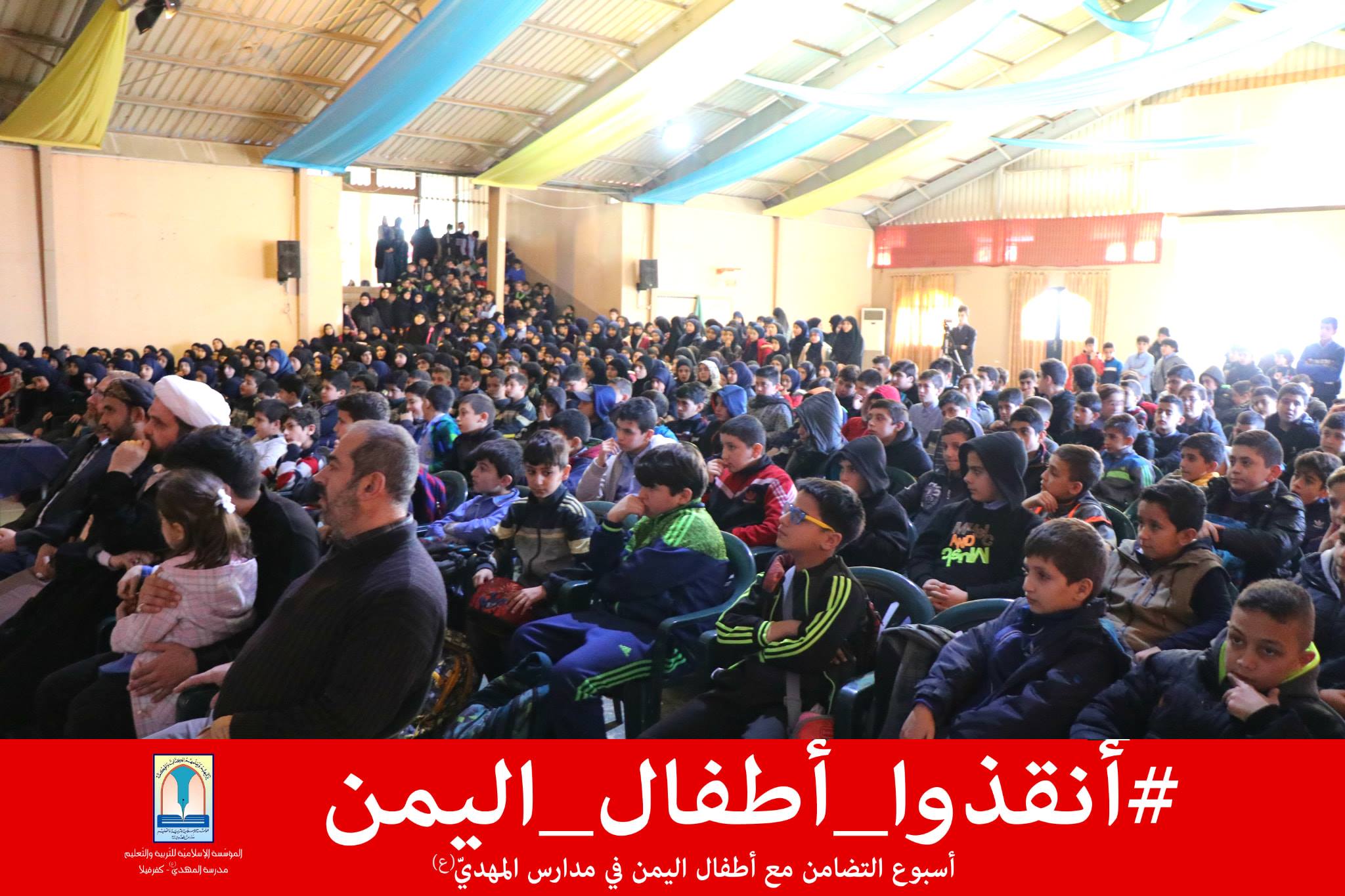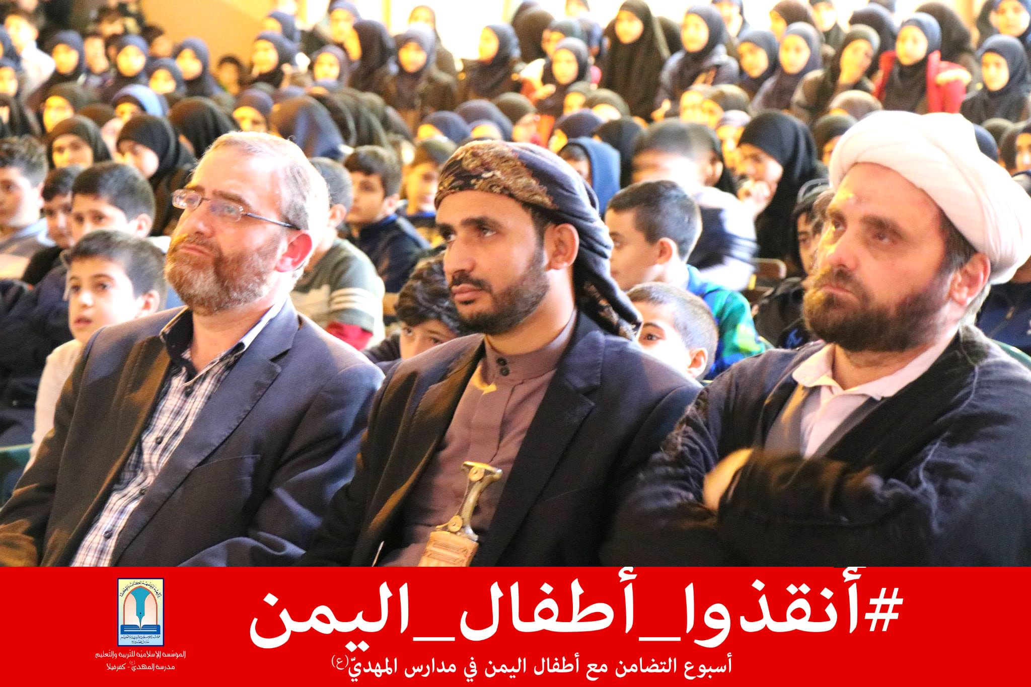 ضمن فعاليات أسبوع التّضامن مع أطفال اليمن في مدارس المهدي(ع) الذي أطلقته المؤسسة الإسلاميّة للتربية والتّعليم تحت شعار: "أنقذوا أطفال اليمن"، نظّمت مدرسة المهدي(ع) كفرفيلا وقفة تضامنيّة مع الشعب اليمني العزيز وذلك بحضور رئيس الملتقى اللبناني اليمني لمناهضة العدوان على اليمن السّيد أحمد عبد الملك الشامي، ومدير المدرسة الأستاذ محمد طفيلي والكادر التعليمي والإداري وتلامذة الحلقة الثانية والثالثة.