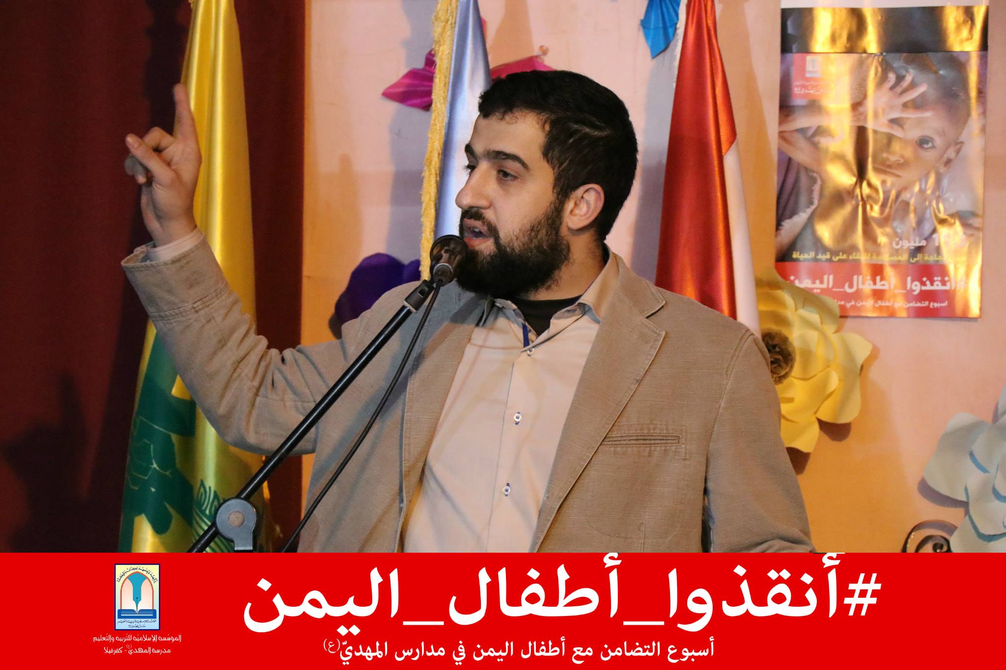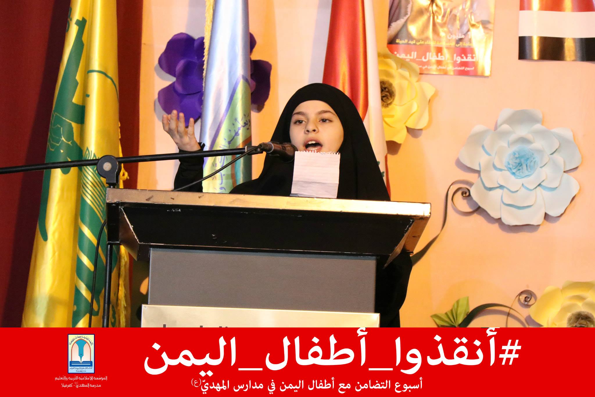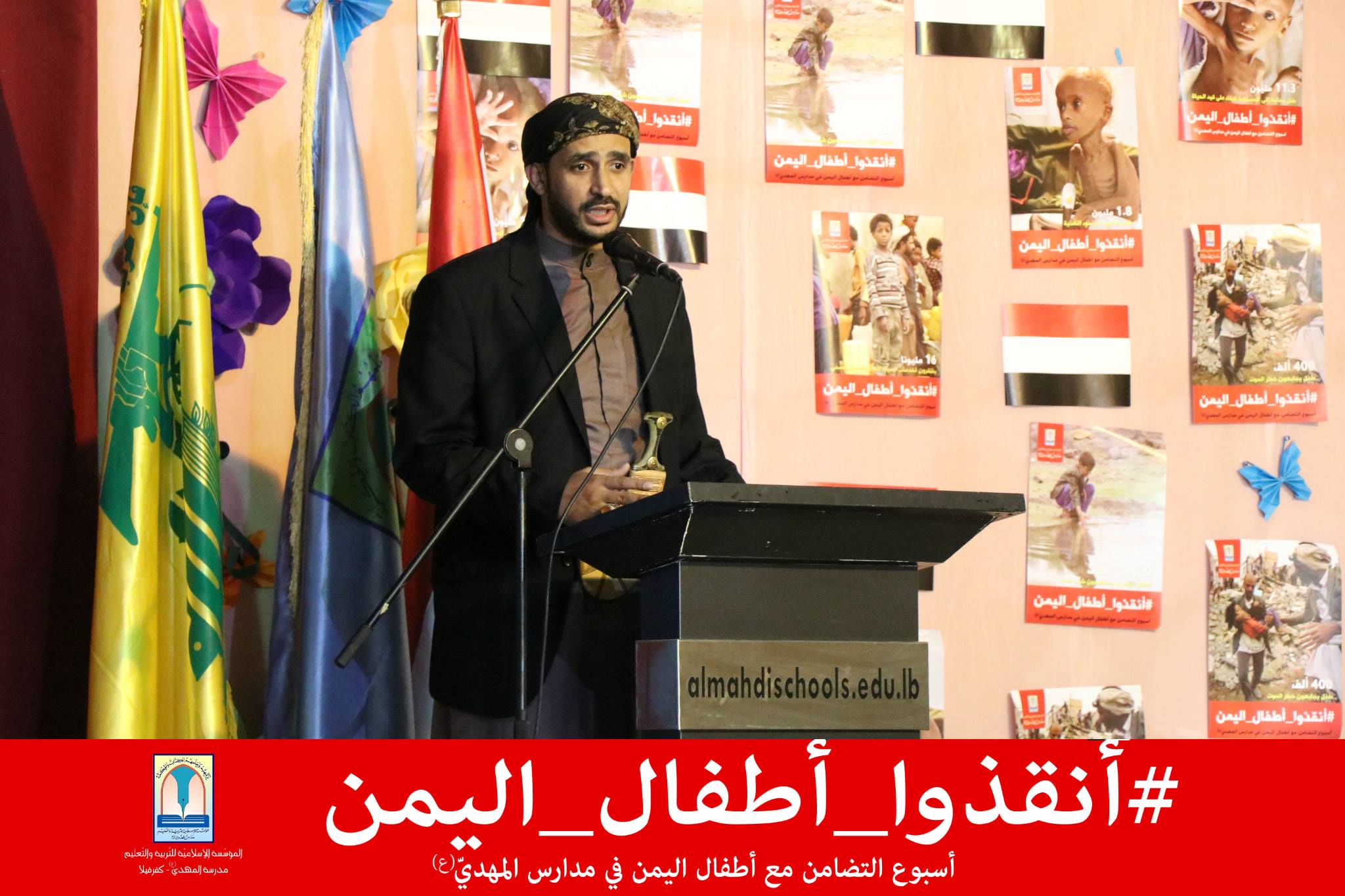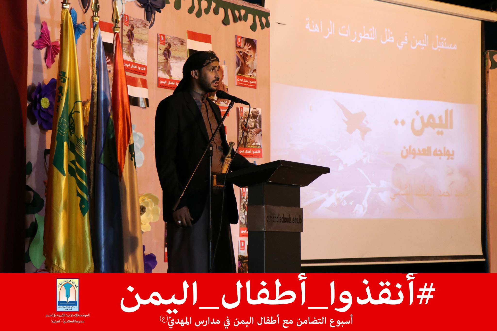 افتتح النّشاط بتلاوة آيات من الذكر الحكيم وكلمات معبّرة عن التّضامن والدّعم قدمتها تلميذتان من المدرسة، ثم كان للأستاذ مصطفى شريم أبيات شعرية ألقاها تحية لأبطال اليمن، من بعدها ألقى السّيد أحمد عبد الملك الشامي كلمته المعبّرة عن الشكّر والامتنان لهذه الوقفة التضامنيّة وهذا الدعم المميّز لشعب اليمن وأطفاله من قبل تلامذة مدارس المهدي(ع). استعرض خلال كلمته خارطة اليمن والأوضاع الحالية فيها، بالإضافة لمجموعة من الصور المعبّرة عن حجم الدّمار والحصار المفروض على اليمن، ليختتم كلمته بنداء شعار المقاومين اليمنيين علت فيها قبضات وصرخات التلامذة معه وهم حاملون الشعارات الرافضة للعدوان السعودي الأمريكي الوحشي.