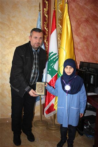 كرم مدير مدرسة المهدي(ع)-النبي شيث التلامذة أبناء الشهداء من خلال استقبالهم في مكتبه حيث تحدث إليهم عن عظمة العطاء الذي قدمه آباءهم الشهداء كما ووزع عليهم نسخا من القرآن الكريم موضوع في داخل غلافها صوراً للآباء الشهداء واختتم اللقاء بالتقاط صورة تذكارية معهم .