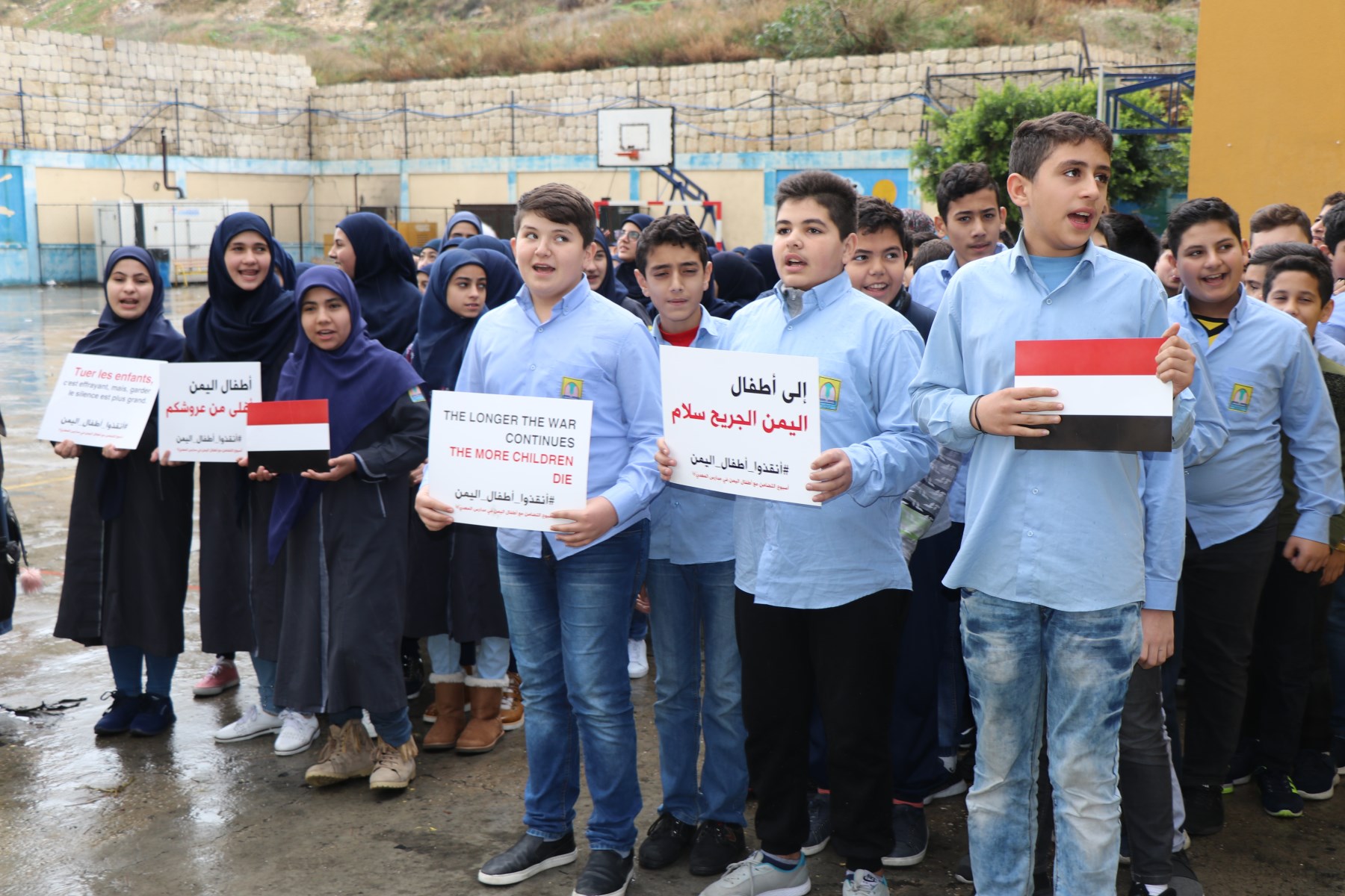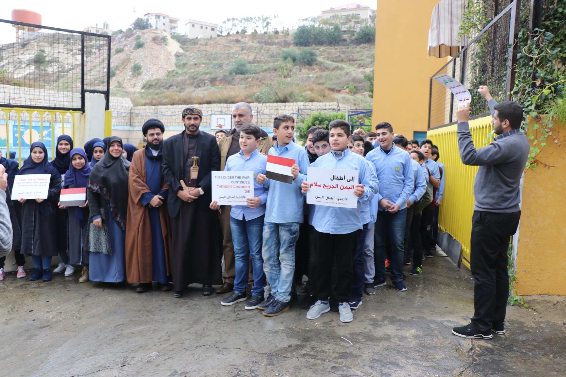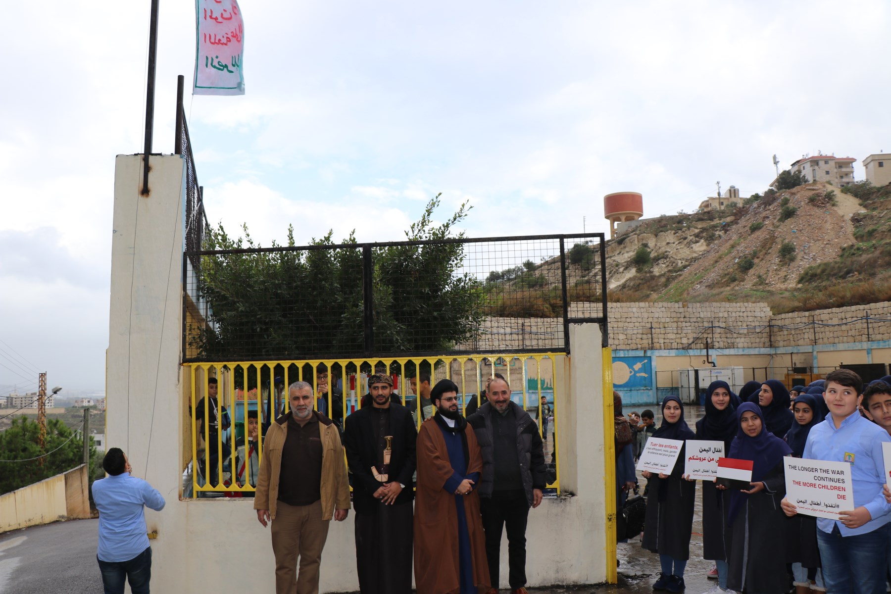 راية أنصار الله ترفع عند المدخل الأساسي لثانوية المهدي (ع) – الغازية على وقع صرخة الحوثيين ردّدها تلامذة الصف الثامن الاساسي مع رئيس الملتقى اللبناني اليمني لمناهضة العدوان على اليمن