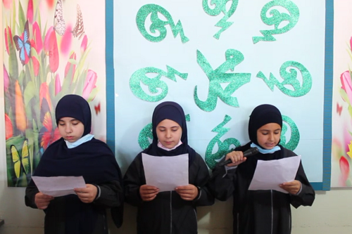 رسول الله : لن يشقى من لاذ بك ولن يُهان من أَحبَّك وعشقك.. * على حب الرسول (ص) وبمناسبة ولادته الميمونة تم إفساح المجال أمام تلامذة الحلقتين الثانية والثالثة في مدارس المهدي (ع) الأحمدية لإلقاء القصائد الرائعة بحقّ نبيهم (ص) وذلك أمام أقرانهم في الملعب على مدى أسبوع.