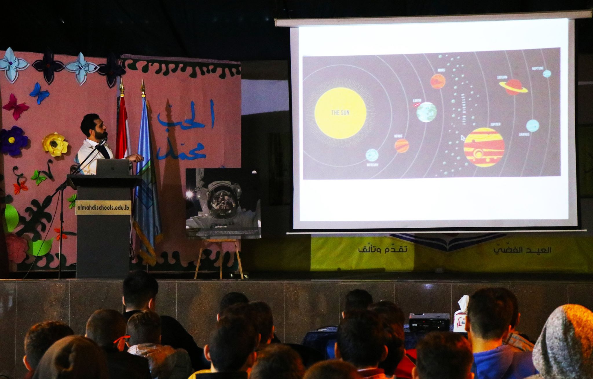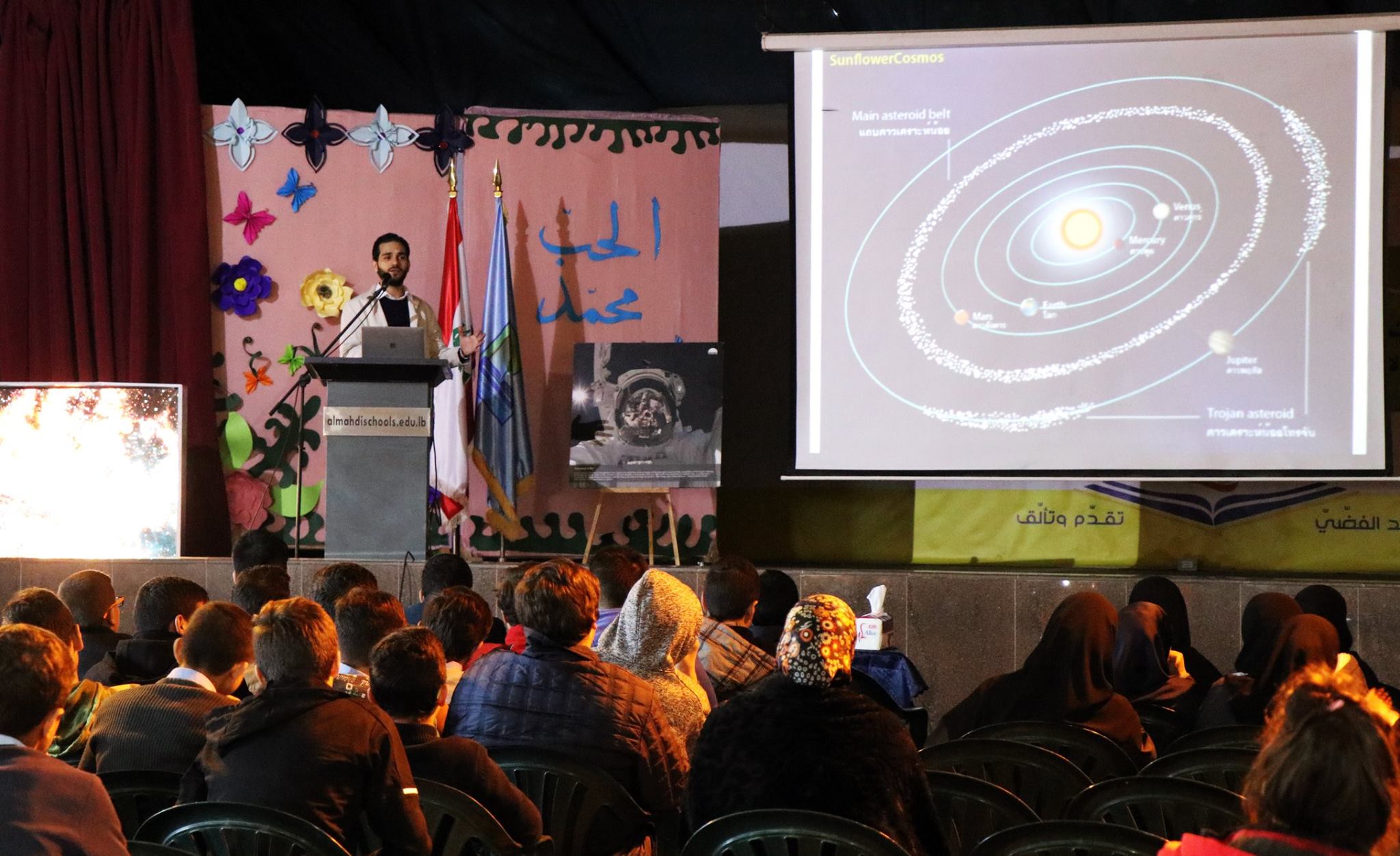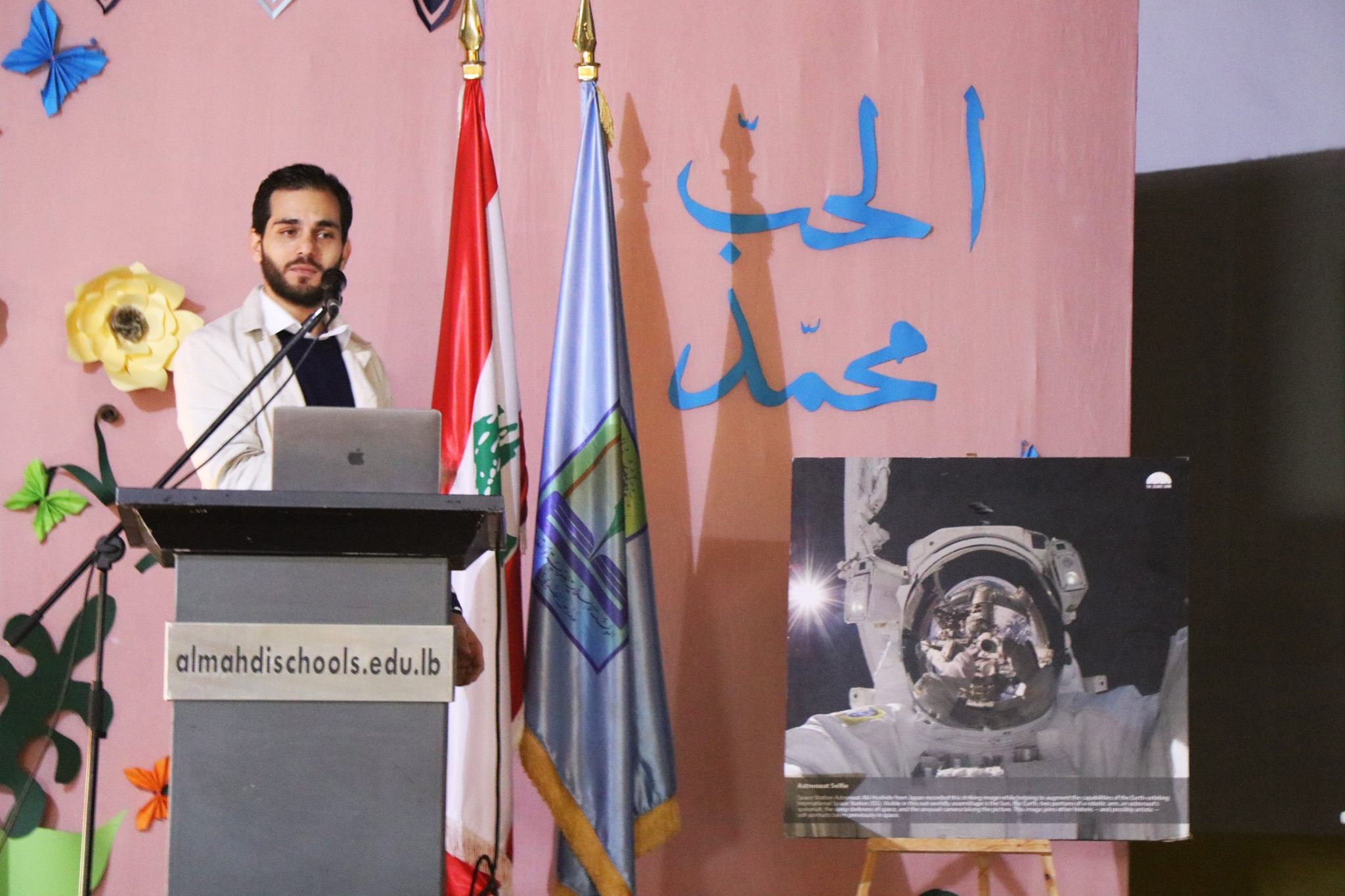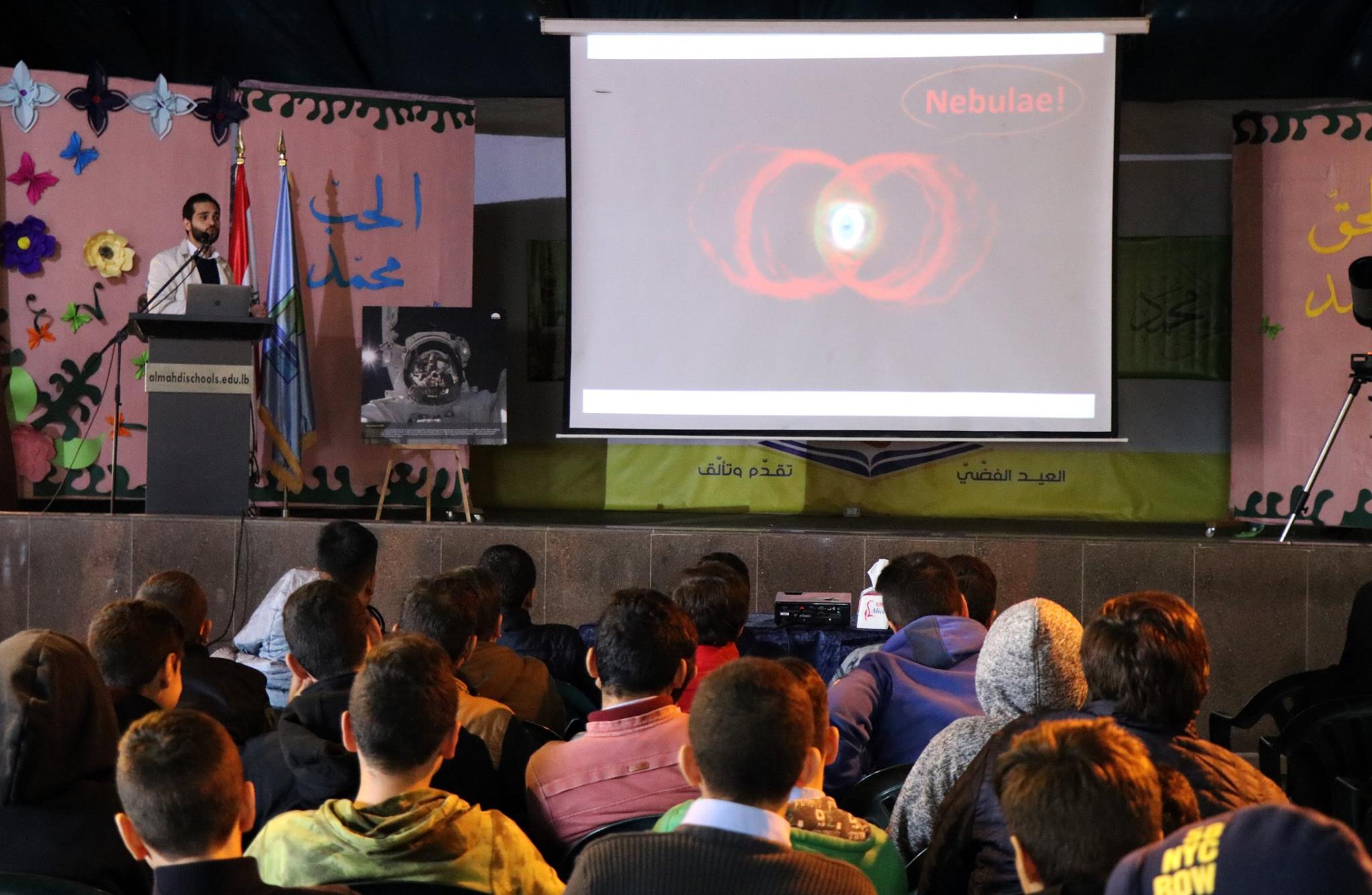 افتتح اللّقاء بآيات من الذكر الحكيم تتحدث عن عظمة الكون والخلق وعن الرسول محمد(ص)، أعقبها خاطرة من وحي المناسبة للأستاذ مصطفى شريم، ثم قدم الدكتور محمد عباس محاضرته حول عدد من المفاهيم العلمية كالسّنة الضوئية ونشأة الكون وما فيه من كواكب ونجوم وثقوب سوداء، وتداخل المجرات، تخللها عدد من الأسئلة والاستفسارات من قبل التلامذة والحضور.