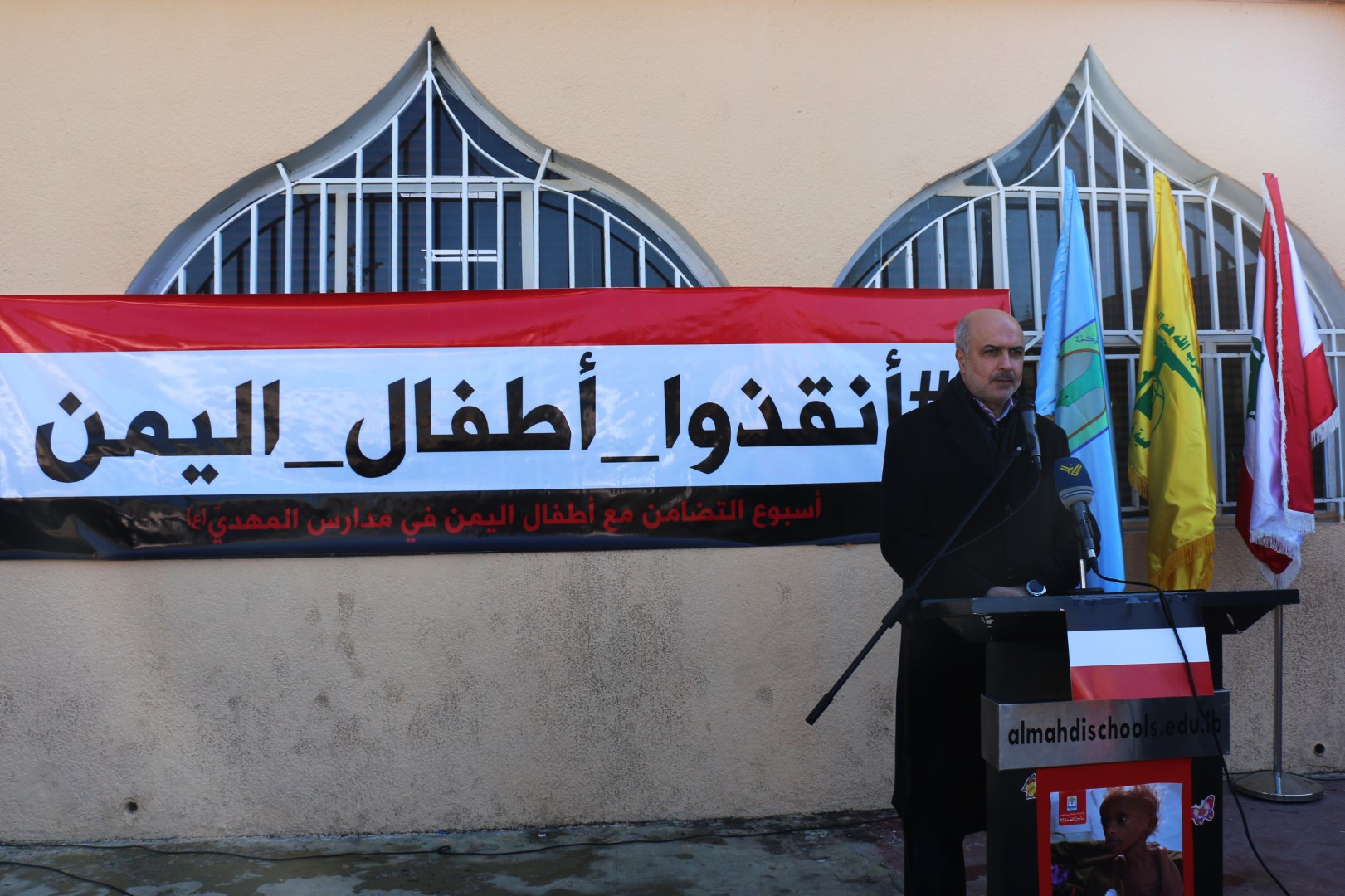 ثمّ كانت كلمة لمدير المدرسة الأستاذ عليّ الموسويّ قال فيها: "إنّه من النعم الكبيرة أن نرى في مدارس المهديّ (ع) أطفالًا يقفون تضامنًا مع أطفال اليمن الذين تآمر عليهم العالم كلّه ليحرمهم من العلم ويجوّعهم". وأضاف: إنّ الوقفة إلى جانب هؤلاء الأطفال تجعلنا مطمئنّين أنّنا نقف إلى جانب الحقّ".