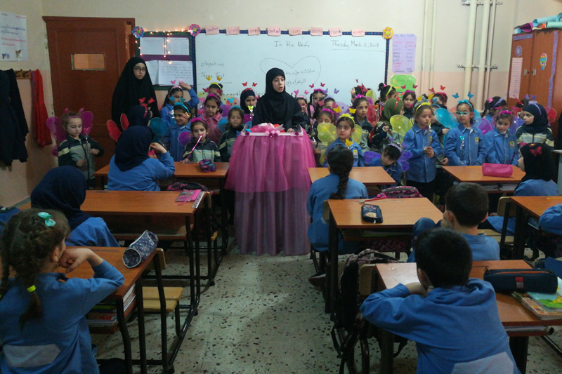 على وقع أناشيد مولد الزهراء عليها السلام قامت ثلاث تلميذات من الحلقة الثالثة في مدرسة المهدي(ع)-النبي شيث بجولة على صفوف تلامذة الحلقة الأولى حيث تم سرد قصة عقد السيدة الزهراء (ع) وتوزيع هدايا على التلميذات اللواتي يحملن إسماً من أسماء بضعة الرسول كما ونفذ التلامذة ثلاث أعمال عبارة عن دعاء الإمام الحجة والصلاة على محمد وآل محمد وزيارة السيدة فاطمة(ع) ووزعت الضيافة على الجميع.