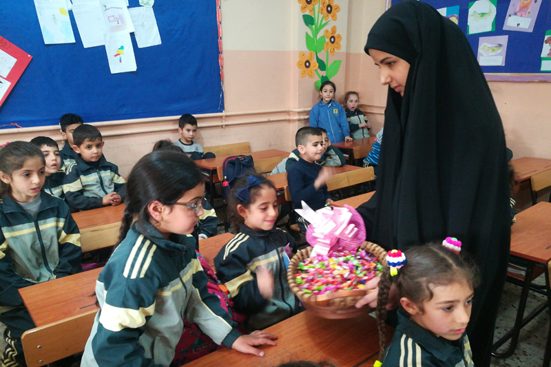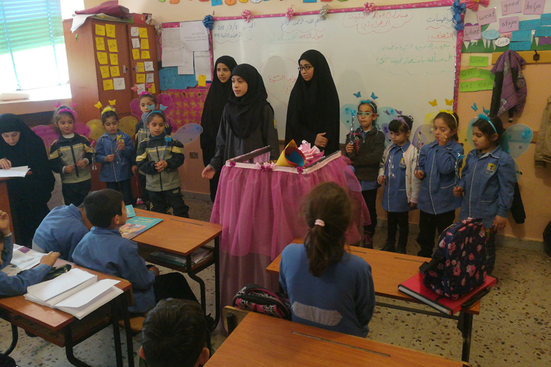 على وقع أناشيد مولد الزهراء عليها السلام قامت ثلاث تلميذات من الحلقة الثالثة في مدرسة المهدي(ع)-النبي شيث بجولة على صفوف تلامذة الحلقة الأولى حيث تم سرد قصة عقد السيدة الزهراء (ع) وتوزيع هدايا على التلميذات اللواتي يحملن إسماً من أسماء بضعة الرسول كما ونفذ التلامذة ثلاث أعمال عبارة عن دعاء الإمام الحجة والصلاة على محمد وآل محمد وزيارة السيدة فاطمة(ع) ووزعت الضيافة على الجميع.