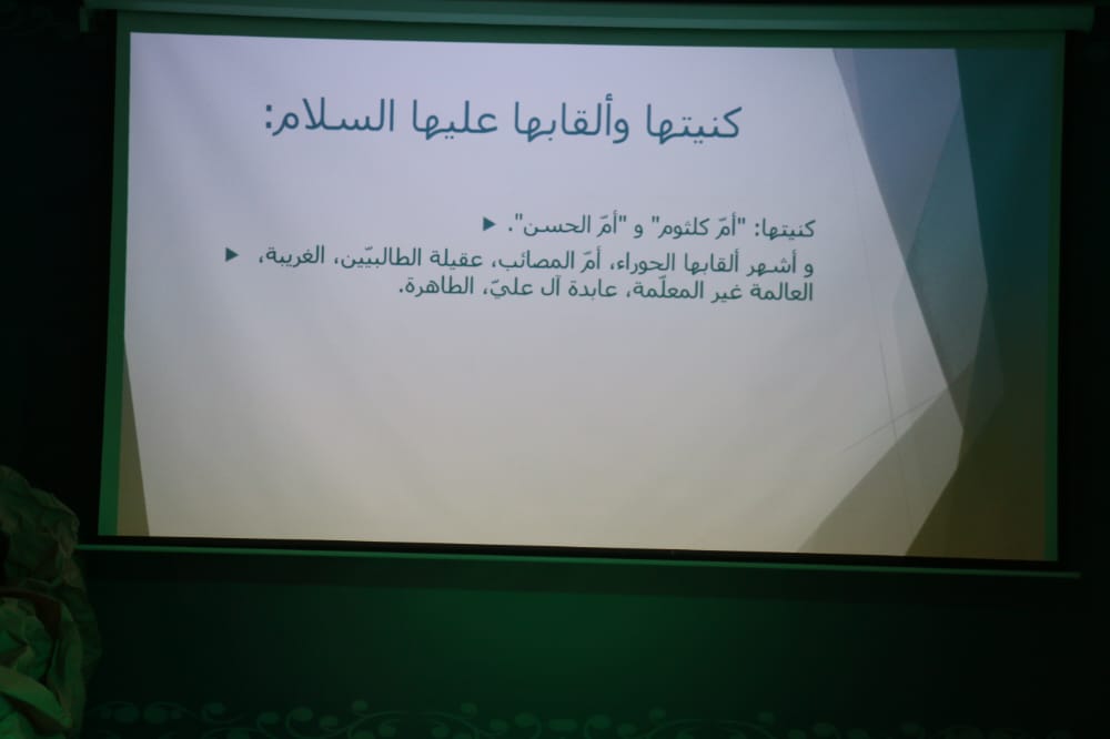 قدمتها الأخت حوراء عكر وتوزيع هدايا على الفتيات بعدها قدمت اللجان الطلابية باقة من الانشطة المتنوعة أعقبه عرضا عبر الشاشة السيدة زينب القدوة والأسوة للتلميذتين لين النمر وزهراء اللقيس.