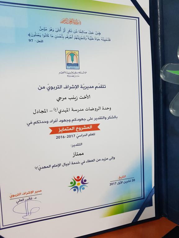 أقامت مديريّة الإشراف التّربوي في المؤسّسة الإسلاميّة للتربية والتعليم – مدارس المهدي (ع)، حفلاً تكريميّاً للمنسّقين والمشرفين الذين شاركوا في فعّاليات المشروع التمايز للعام الدّراسي 2016-2017. المشروع السّنوي الذي ينطلق من تقييم واقع العمليّة- التعليميّة، بما لها من خصائص وخصوصيّات، ويركّز على تحسينها وتجويدها وتطويرها، ما يحدث تحسّناً في نوعيّة أداء المعلّمين ويزيد من قدرة المتعلّمين على اكتساب الكفايات والأهداف. وقد فازت وحدة الرّوضات في مدارس المهدي(ع)– المجادل بدرجة ممتاز عن المشروع الذي أعدّته المنسّقة، وتكاملت الجهود مع الكادر التربوي في المدرسة لإنجاحه.