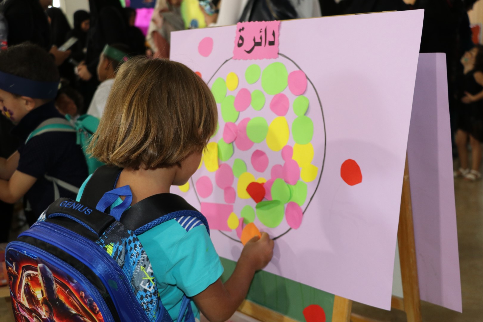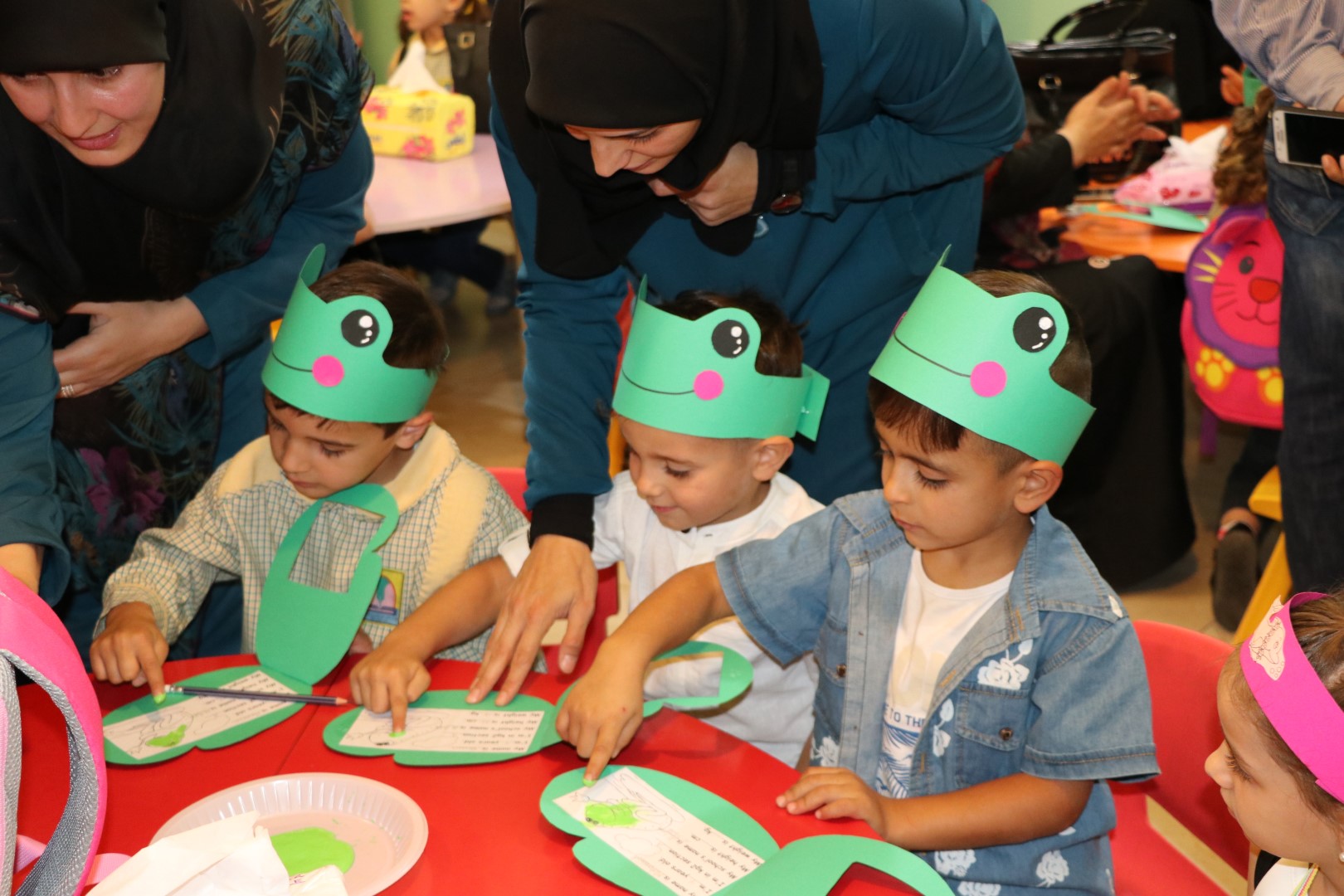 بداية تعرف التلامذة على صفوفهم ومعلماتهم ونفذوا بمشاركة أمهاتهم بطاقات تعرف عنهم، إضافة إلى تزيين شعار الصف.